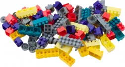 Stolek disponuje hračkářským povrchem, na kterém mohou děti skládat různé konstrukce z barevných kostek.