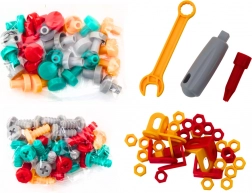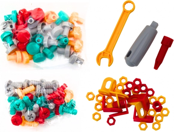 Dále jsou v sadě klíč a šrouby, které podporují představivost a jemnou motoriku. Stolek umožňuje rozmanité způsoby hraní, od stavění až po soutěživé rybaření. Pomáhá rozvíjet motorické schopnosti, logické myšlení a kreativitu.