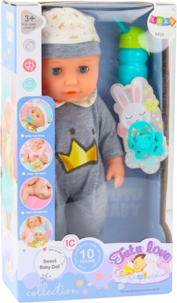 Na břiše panenky je reproduktor, který po stisknutí tlačítka přehrává různé zvuky miminka. Tato funkce rozvíjí dětskou představivost a sluchové schopnosti.