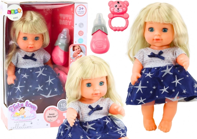 Elegantní panenka v námořnických šatech s dlouhými blond vlasy nabízí možnost česání a úpravy do různých účesů. Její realističnost je podpořena pohyblivými končetinami a zavíracími očima, které napodobují miminko zavírající oči při spánku.