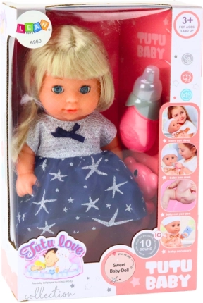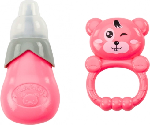 Součástí setu je kojenecká lahvička, která po naplnění vodou umožňuje "čůrání" panenky. Chrastítko podporuje motorický rozvoj a koordinaci.