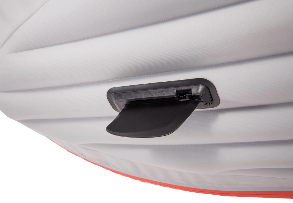 Praktická výbava zahrnuje integrované držáky prutů, úložné prostory v přídi i zádi s nerezovým kroužkem pro zajištění výbavy a odnímatelnou směrovou ploutev pro lepší vedení stopy. Součástí balení je vše potřebné k okamžitému vyplutí – ruční pumpa a dvě pádla – a snadný transport zajišťuje přepravní taška.
