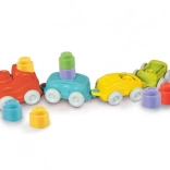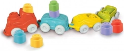 Lokomotiva a tři vagónky se snadno spojují a oddělují, takže si děti mohou vytvářet vlastní soupravy. Kola umožňují plynulý pohyb vláčku, což podporuje aktivní hraní a rozvoj fantazie. Kostky lze vkládat do vagónků nebo stavět do stabilních věží – ideální pro první stavby a komíny.