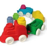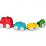 Lokomotiva a tři vagónky se jednoduše spojují a oddělují. Kola umožňují plynulý pohyb vláčku a podporují aktivní hraní i tvorbu příběhů.