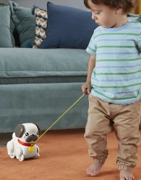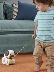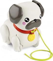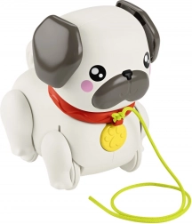 Jakmile dítě zatáhne za provázek, mopsík začne hýbat oušky i tlapkami a vydávat radostné štěkání, které vybízí k dalšímu objevování.