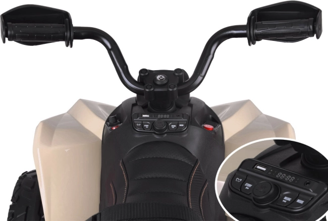 Tato robustní dětská čtyřkolka 24V si hravě poradí s travou, nerovnostmi i lehkými stoupáními. Startuje se stiskem tlačítka a po přidání plynu pedálem v pravé stupačce nabídne jistý záběr bez trhání. O zábavu na cestách se stará hudební panel s přednahranými melodiemi, USB, MP3 a FM rádiem.