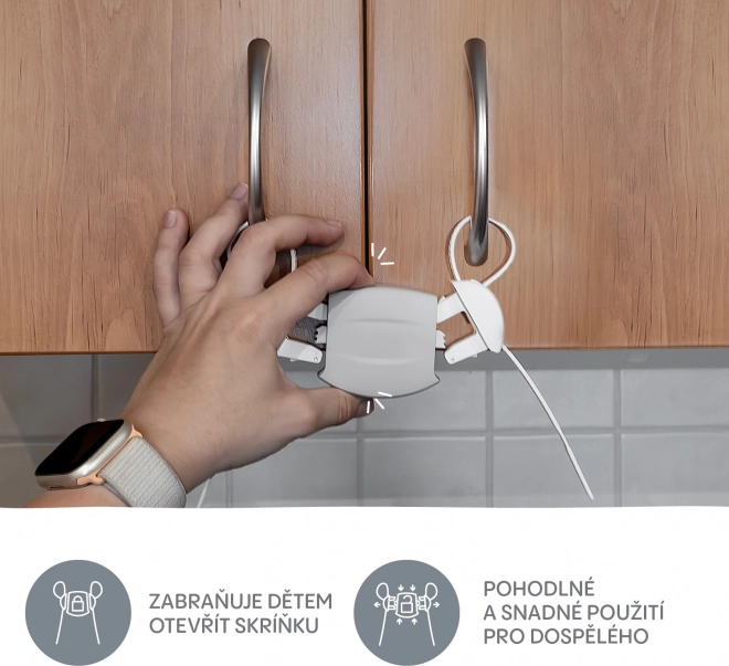 Univerzální zámek brání dětem v přístupu ke skříňkám a zásuvkám, čímž minimalizuje riziko nebezpečí.