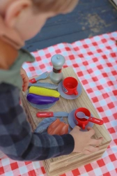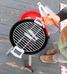 Set obsahuje vše, co je potřeba k napodobení rodinného BBQ: štěrbiny na roštu, bohatý výběr plastových potravin (klobásky, steaky, kuře, ryby, kukuřice, lilek), náčiní, talířky, kelímky a dokonce i mlýnek na pepř. Odnímatelné víko chrání rošt po „grilování“ a díky kolečkům a madlu děti gril snadno přesunou na terasu nebo do dětského pokoje.