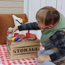 Odnímatelné víko chrání rošt, zatímco kolečka a madlo usnadňují přesun po domě i zahradě. Pevná konstrukce zvládne každodenní hraní.