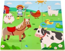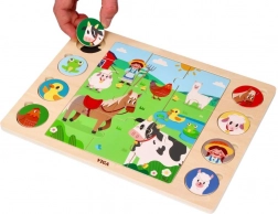 Toto chytré puzzle spojuje dvě aktivity: nejprve děti poskládají středový obrázek z 9 velkých dílků, poté přiřazují 8 kulatých žetonů se zvířátky do odpovídajících stínů na desce. Hra přirozeně podporuje rozvoj slovní zásoby – po dokončení skládání mohou děti zvířátka pojmenovávat a hledat je na velkém obrázku farmy.