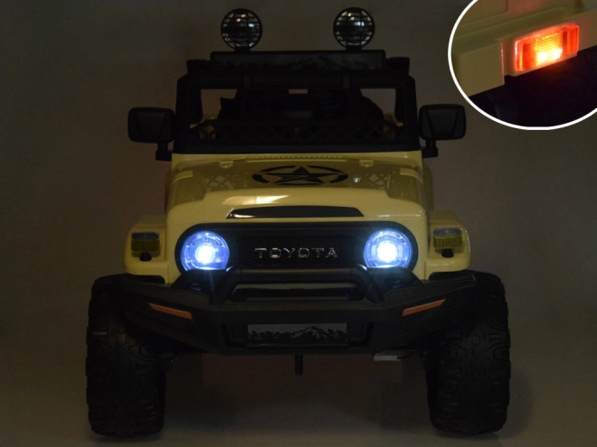 Licencované elektrické autíčko TOYOTA FJ Cruiser s pohonem 12 V nabízí 2 silné motory vzadu + 2 pomocné vpředu, plynulý rozjezd a rodičovské ovládání 2,4 GHz. Děti potěší světelné efekty, panel s USB/MP3, zvuky motoru a klakson. Komfort zajišťuje měkké sedadlo z eko kůže, 3bodový pás a kola z EVA pro tichou a pohodlnou jízdu i na trávě.