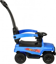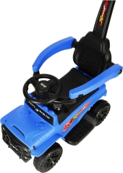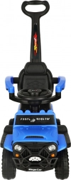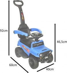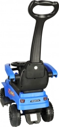 Modré dětské odrážedlo ve stylu terénního auta kombinuje zábavu a bezpečí. Díky vodicí rukojeti, ochranným bariérkám a opěradlu je ideální na společné procházky, zatímco světelné a zvukové efekty podpoří fantazii a radost z jízdy.