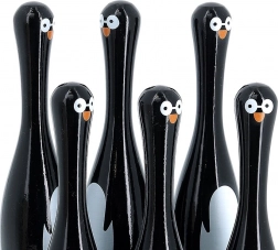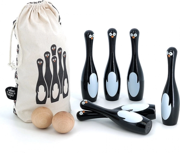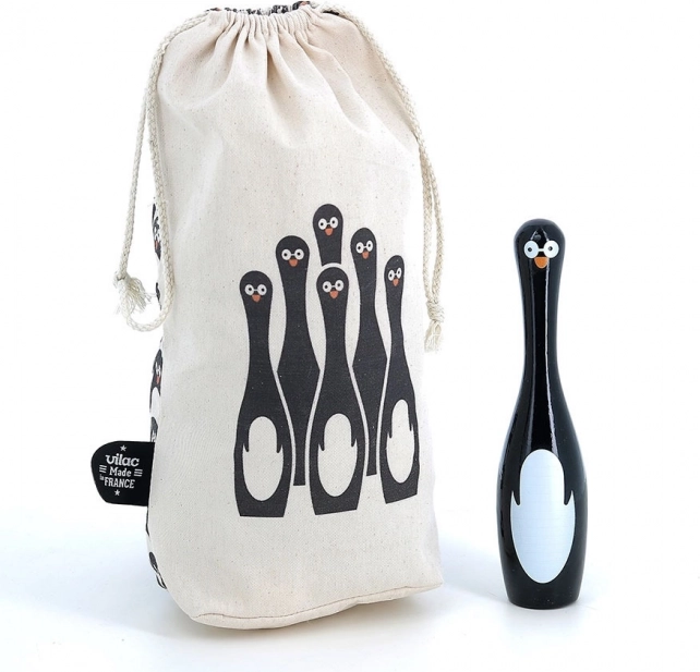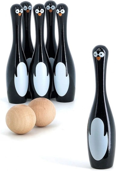 Sada obsahuje šest kuželek ve tvaru tučňáků a dvě dřevěné koule. Tato hra nejen že poskytuje hodiny zábavy, ale také pomáhá rozvíjet motoriku a obratnost. Kuželky byly vyrobeny ve Francii za použití tradičního procesu lakování, zajišťující vysokou kvalitu a trvanlivost.