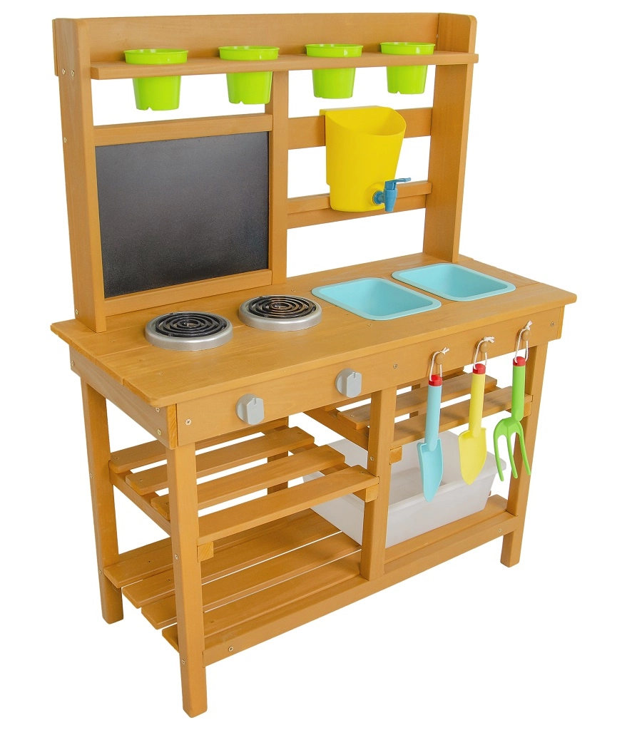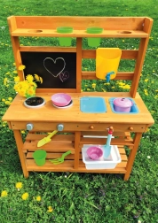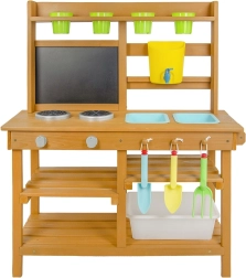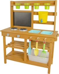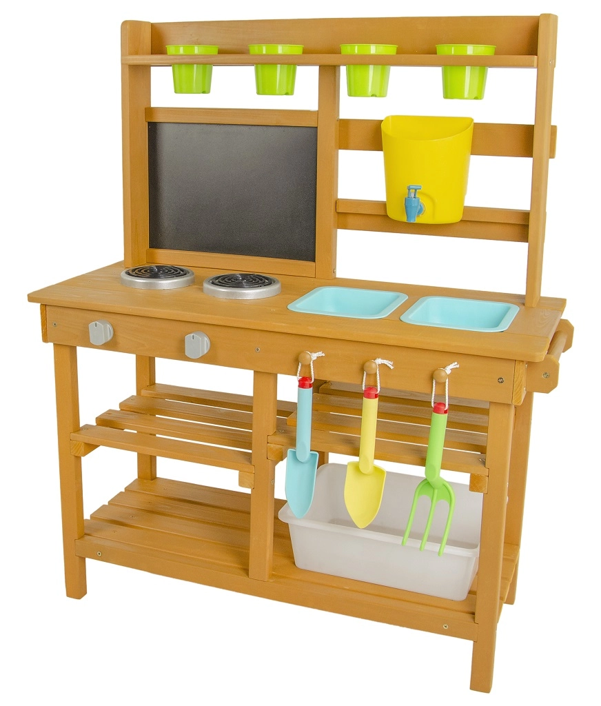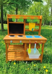 Nabídněte si svačinku přímo pod obzory přírody! Na místě, kde pokrmy voní po svěžím vánku a slunce opéká bochníky z písku a vody. Tato zahradní kuchyňka nabízí skvělou možnost jak u dětí rozvíjet kreativitu, samostatnost a pílit své kulinářské dovednosti přímo na čerstvém vzduchu. Disponuje užitečnými prvky jako např. kohoutek, vařič, kuchyňské náčiní (v podobě lopatky a malých hrábí) či kyblíčky. Rozsáhlé úložné prostory přijdou jistě také vhod. Jaké je tedy dnešní menu? Čistá fantazie! Hlavní vlastnosti: kompaktní rozměry, součástí je příslušenstvímultifunkční, rozmanité využitírozměrný úložný prostor