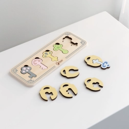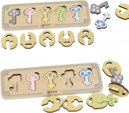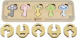 Tato smyslová montessori vkládačka přináší dětem od 18 měsíců zábavný způsob, jak trénovat logiku a trpělivost. Každý z 5 klíčů má vlastní tvar i barvu a dítě jej zasunuje do odpovídajícího „zámku“. Deska zároveň nabízí praktické uložení všech klíčů, takže je hra vždy přehledná.