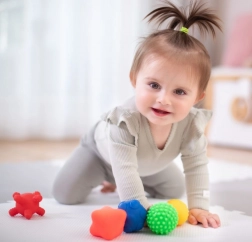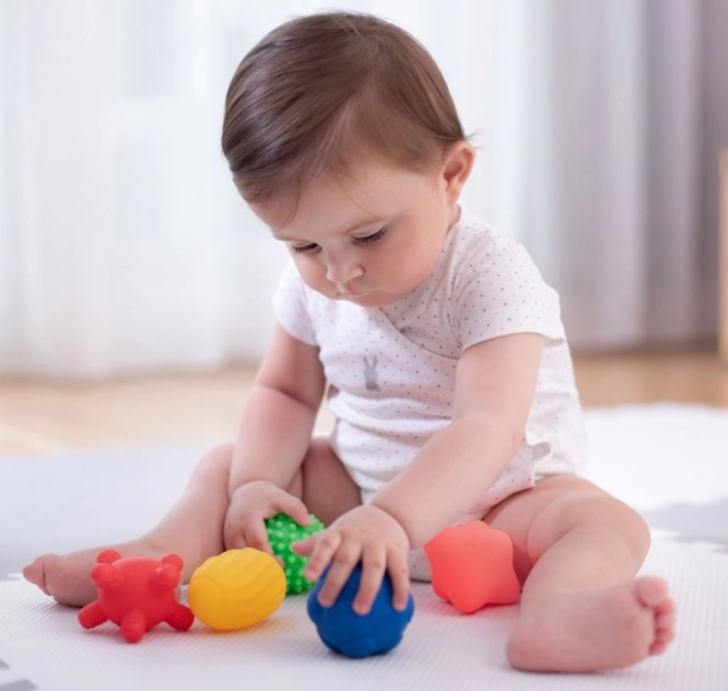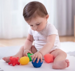 Každý míček má jedinečný povrch, který stimuluje hmat a motivuje děti k objevování, mačkání a uchopování.