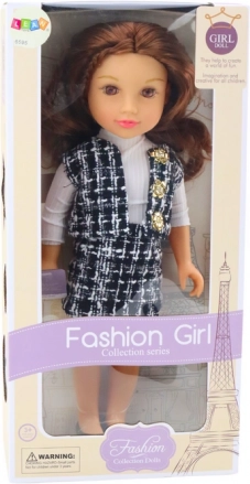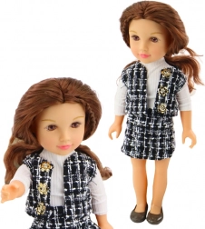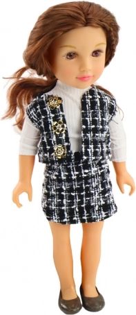 Panenka se pyšní elegantním oblečkem skládajícím se z černo-bílé kostkované sukně a vesty, které dohromady vytváří jedinečný styl. Bílá košile s dlouhým rukávem doplňuje celkový vzhled a přidává klasický nádech.