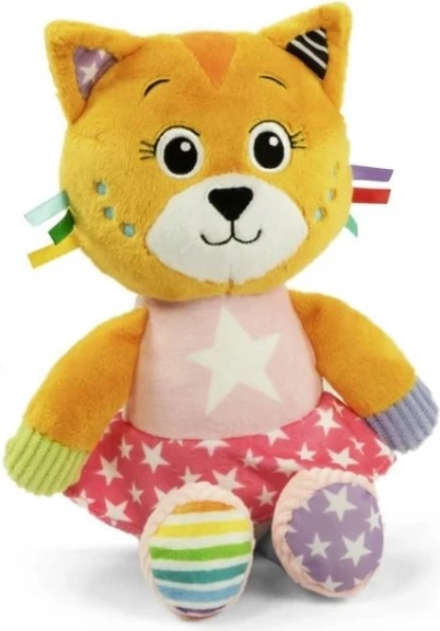 Plyšová kočička vyniká pestrobarevným vzhledem s různorodými texturami, které stimulují dětská smyslová vnímání.