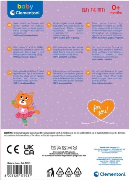 Plyšová hračkářská kočička Katka od Clementoni Baby je ideální společník pro malé děti. Je měkká, barevná a plná atraktivních detailů, které zaujmou a podpoří smyslový vývoj miminek.