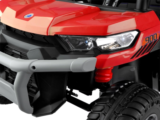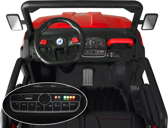 Malý řidič ocení realistickou palubní desku s voličem směru (D/P/R), zvuk nastartovaného motoru, USB vstup a přehrávání melodií. Rodiče mají vše pod kontrolou díky ovladači 2,4 GHz (řízení vpřed/vzad, vlevo/vpravo, volba rychlosti a nouzové zastavení). Otevírací dveře s pojistkou usnadní nastupování a bezpečnost zvyšují pásy.