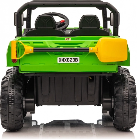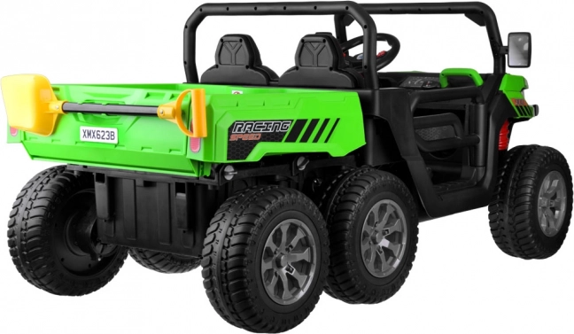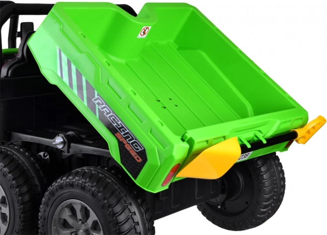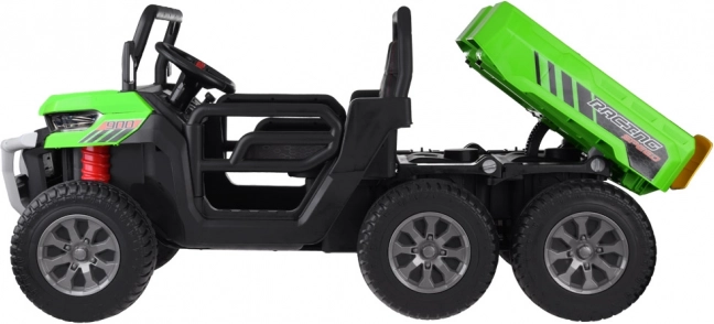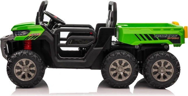 Robustní dětské elektrické auto 24V s 6 koly, dvoumístným sedadlem z ekokůže a elektrickou vyklápěcí korbou pro parádní venkovní zábavu. Nabízí 4 výkonné motory, měkká EVA kola, pomalý rozjezd, přední osvětlení a rodičovské dálkové ovládání 2,4 GHz pro bezpečnou jízdu. Ideální na převážení hraček, listí či piknikového košíku.