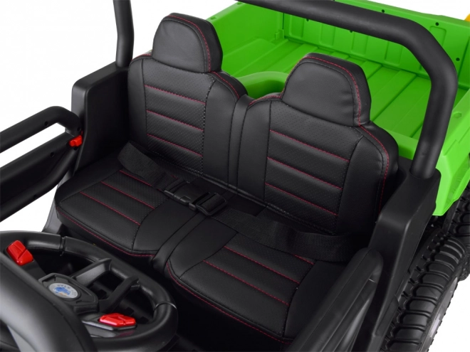 Široké dvoumístné sedadlo z ekokůže, bezpečnostní pás a otvírací dveře s blokací zajišťují pohodlnou a bezpečnou jízdu pro dvě děti.