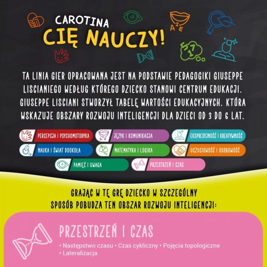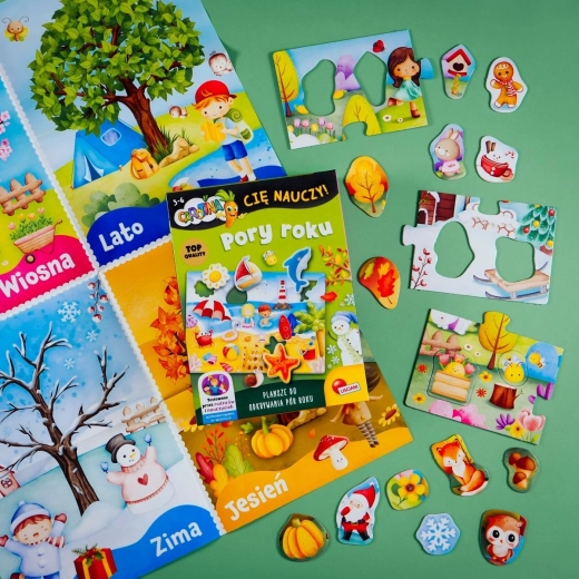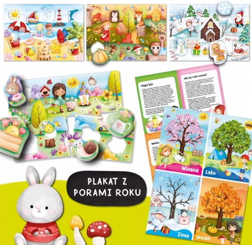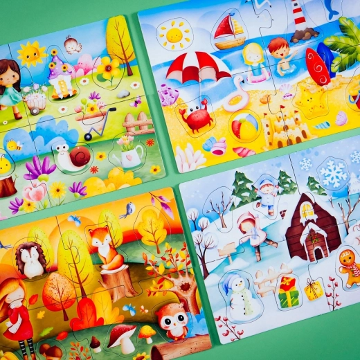 „Carotina tě naučí! Roční období“ je chytře navržená vzdělávací hra, která pomáhá dětem pochopit jaro, léto, podzim a zimu pomocí čtyř ilustrovaných herních desek. Každá deska zobrazuje typické činnosti a předměty daného období, které děti přiřazují pomocí vyřezaných prvků.