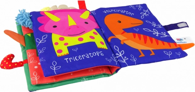 Objevte první čtení plné dinosauří zábavy! Tato měkká látková knížka s osmi stranami a barevnými ilustracemi inspiruje k objevování a podporuje smyslový rozvoj, jemnou motoriku i první angličtinu. Díky bezpečnému zapínání na suchý zip se snadno skladuje a je ideální na cesty.