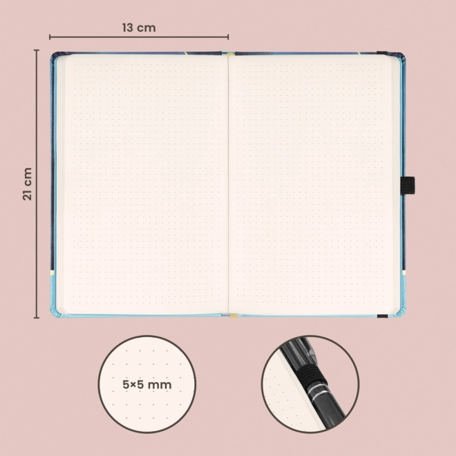Elegantní notýsek s motivem díla Alfons Mucha – Luna v pevných deskách. Nabízí tečkovaný rozvrh pro kreativní zápisky, uzavírání na gumičku, kapsu na drobnosti a poutko na tužku. Uvnitř je 172 stran na příjemném žlutém papíře o velikosti 13 × 21 cm – ideální pro plánování, bullet journal i skicování.