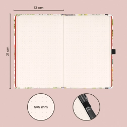 Díky tečkovanému lineaturu je skvělý pro psaní, skicování, bullet journal i tvorbu seznamů. Pevné desky chrání obsah a doplňky jako gumička, kapsa a poutko na tužku udrží vše důležité pohromadě.