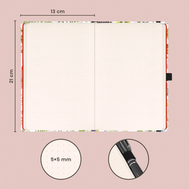 Stylový notýsek z kolekce Kateřiny Winterové s nostalgickými motivy bylin je ideální pro každodenní zápisky, plánování i kreativní nápady. Nabízí pevné desky, praktické uzavírání na gumičku, kapsu na drobnosti a poutko na tužku. Uvnitř najdete 172 tečkovaných stran na jemně žlutém papíře ve velikosti 13 × 21 cm.