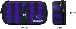 Odolné provedení v černo‑fialových pruzích s ikonickým nápisem Wednesday zajišťuje dlouhou životnost i výjimečný vzhled do školy.