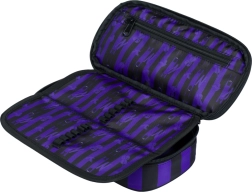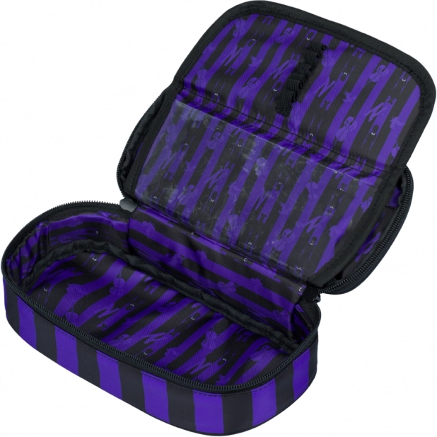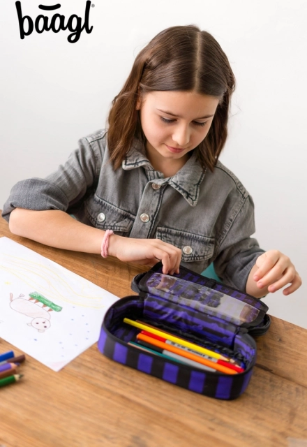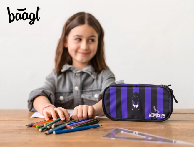 Stylový školní penál BAAGL s motivem WEDNESDAY v černo‑fialových pruzích nabídne pevnou konstrukci, přehledné vnitřní uspořádání s výklopnou přepážkou a praktickou kapsu na zip. Ideální do školy i na cesty, bez náplně – připraven k personalizaci podle vašich potřeb.