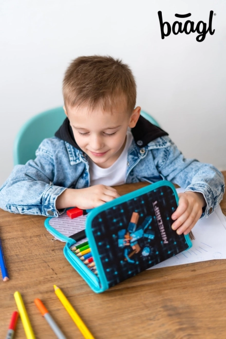 Motiv Minecraft s pixelovanými sekyrami dodává tomuto penálu unikátní herní atmosféru.