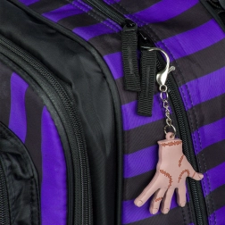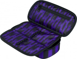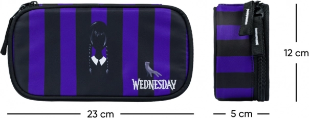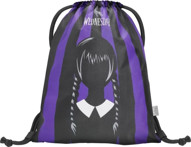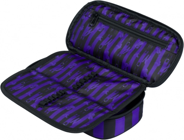 Set Cubic Wednesday obsahuje stylový batoh, praktický penál a sáček na obuv, vše v moderním designu s černými a fialovými pruhy. Batoh je navržen tak, aby splňoval ergonomické potřeby, zatímco penál a sáček zajišťují organizaci školních pomůcek a volnočasových aktivit.