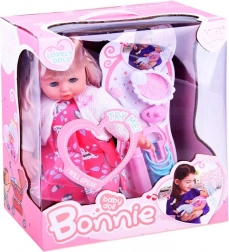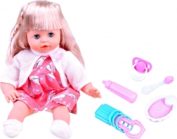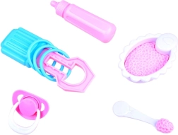 Součástí sady jsou praktické doplňky: miska s kaší, lžička, dudlík, lahvička a chrastítko. Děti mohou krmit, utišovat i uspávat své miminko.