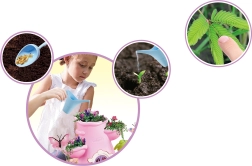 - Kompletní set: domek, květináč, zemina, semínka, zahradní náčiní, konvička, 2× motýlek a zahradní posezení.