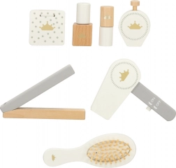 V balení najdete bohatou sadu dřevěných doplňků: kartáč na vlasy, fén, žehličku na vlasy, paletku stínů, „parfém“, lak na nehty a rtěnku – vše jsou bezpečné atrapy pro napodobivou hru bez nepořádku. Toaletka tak podporuje kreativitu, jemnou motoriku a sebeobslužné dovednosti.