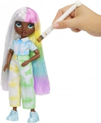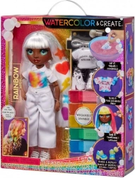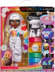 Objev svět barev s kreativní panenkou RAINBOW HIGH Watercolor & Create. Nasyp prášek do vody, namáčej vlasy nebo outfit a pomocí houbičky vytvářej originální vzory. Gumičky využij pro batikování a vytvoř jedinečný streetwear look. Barvy jsou smývatelné, takže můžeš styl měnit pořád dokola.