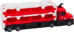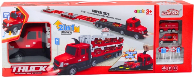 Objevte zábavu 2v1 – velký červený autotransportér, který se po rozložení změní v závodní dráhu dlouhou 211 cm. Součástí jsou světelné a zvukové efekty, 2 hasičská autíčka 1:64 a 7 dopravních značek pro kreativní hraní a učení pravidel silničního provozu.