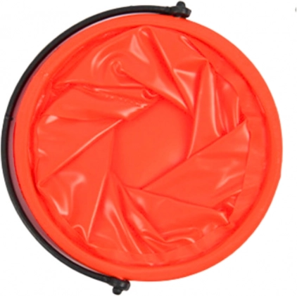 Oranžový skládací kbelík může být snadno složen do plochého tvaru, což usnadňuje jeho uskladnění a přenášení.