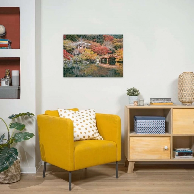 Podzimní paleta červených a oranžových tónů s tradičním mostem a chrámem vytváří motiv, který se skládá s radostí a působí relaxačně.