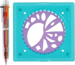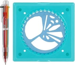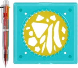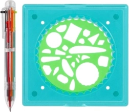 - 4 kolečka s více než 65 tvary, 1 rámeček s protiskluzovým úchopem, šestibarevné pero, kniha s předlohami