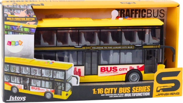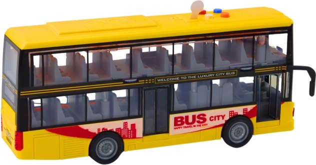 Autobus v ikonické žluté barvě věrně napodobuje skutečný turistický doubledecker. Děti mohou spouštět klakson, zvuk motoru a sledovat blikající světla, což zvyšuje realističnost hry. Setrvačníkový pohon zaručí plynulou jízdu – stačí lehce postrčit a autobus se rozjede.