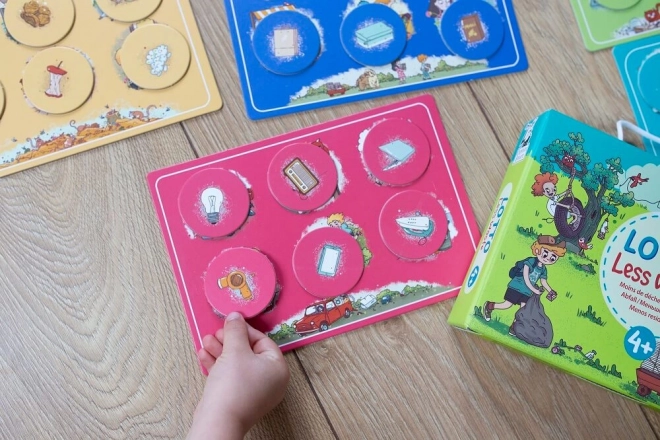 Na deskách najdete předměty denní potřeby i tipy na kreativní opětovné využití. Barvy herních desek a žetonů jsou přizpůsobeny hře a nemusí odpovídat barvám kontejnerů v jednotlivých městech. Jedna hra trvá přibližně 10–20 minut, takže je skvělá i na krátké hraní během dne.