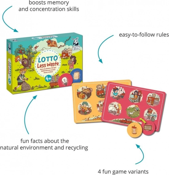 Dejte odpadkům nový život a naučte děti, co patří do plastů, papíru, skla, bioodpadu a elektroodpadu. Hra Captain Smart loto – čistá planeta je jednoduchá a zábavná pro 1–6 hráčů od 4 let, s roztomilými ilustracemi a čtyřmi variantami obtížnosti. Úkolem je přiřazovat žetony ke správným místům na herních plánech, přičemž si můžete o obrázcích povídat a přirozeně rozvíjet slovní zásobu.