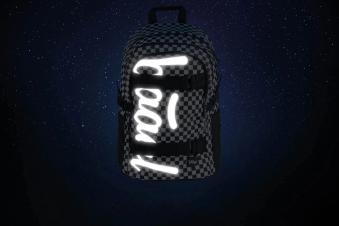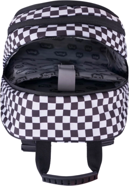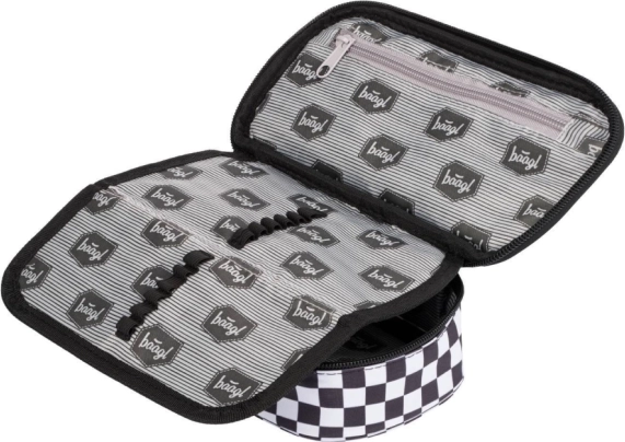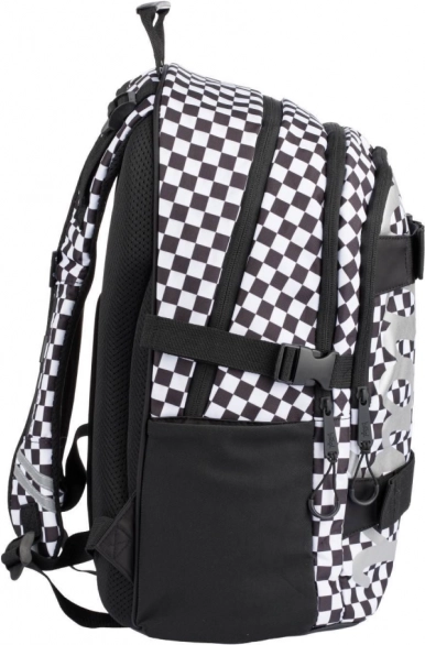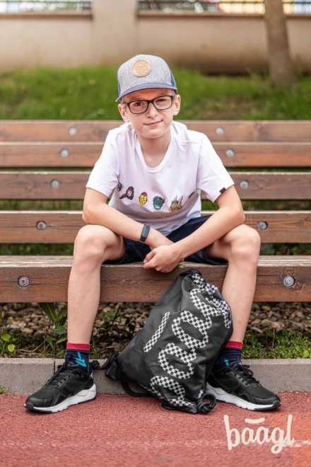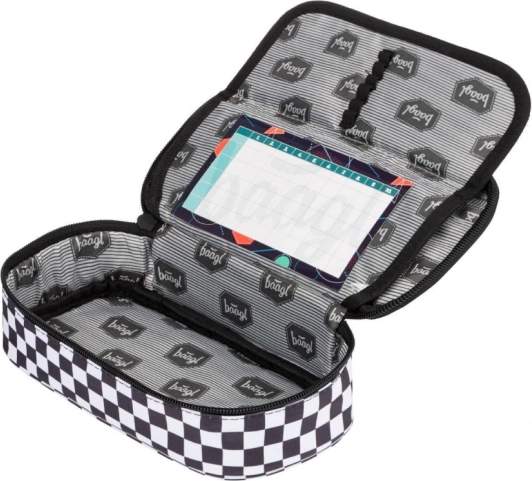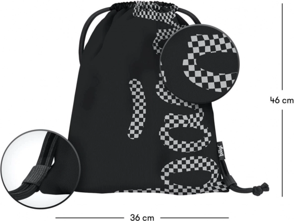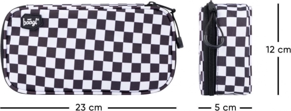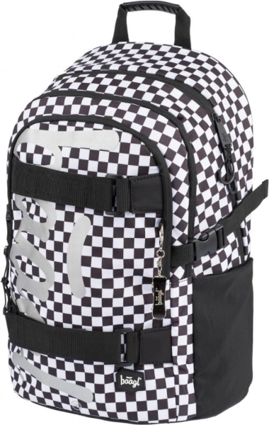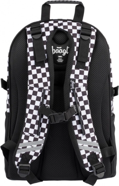 Stylový školní set BAAGL s černobílým kostkovaným motivem obsahuje prostorný batoh, praktický penál a lehký sáček. Batoh nabízí ergonomicky tvarovaná záda, 3 komory s organizérem, kapsu na 15'' notebook a popruhy na skateboard. Díky reflexním prvkům, voděodolnému materiálu a pouhým 850 g je ideální pro školáky i na kroužky.