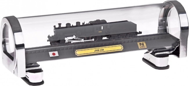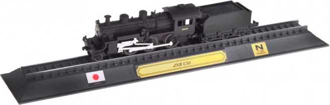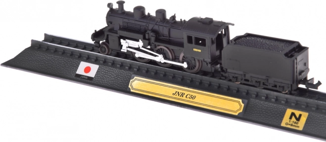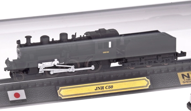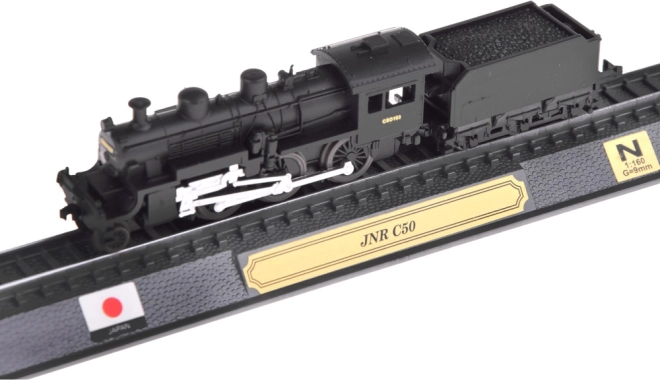 Detailní model parní lokomotivy JNR C50 ve škále 1:160 s realistickými prvky karoserie a podvozku na kolejnicové základně.