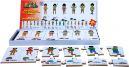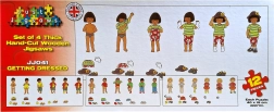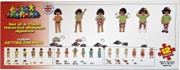 Dřevěný puzzle set od Just Jigsaws představuje čtyři postavy, které děti postupně oblékají, čímž zábavnou formou procvičují logické myšlení a názvy jednotlivých kusů oděvů.