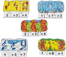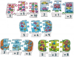 Tato jedinečná sada dřevěných puzzle je ideálním nástrojem pro malé matematiky. Každý z 30 dílků v puzzli zobrazuje obrázky, které odpovídají číslu ve spodní části. Děti mají za úkol správně spojit vždy 3 dílky tak, aby vytvořily správnou odpověď na jednoduchou matematickou úlohu. Puzzle nabízí: